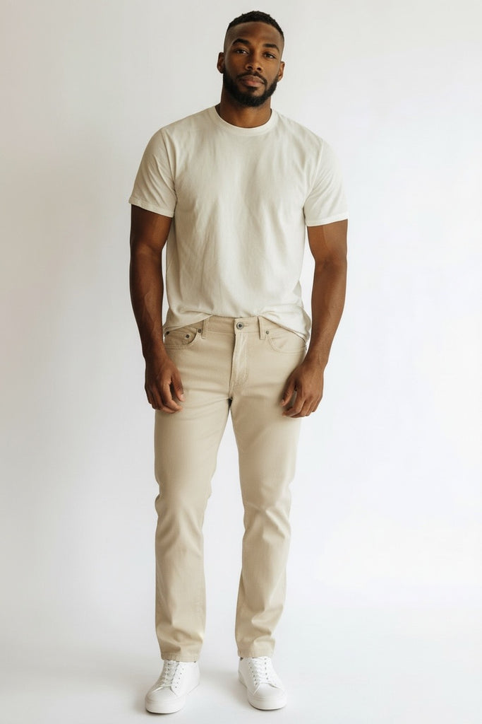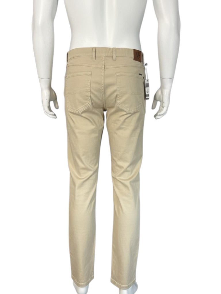 Pantalon beige clair de la marque Bayard pour homme. Confortable et légèrement extensible grâce à sa composition 87% coton et 3% élasthanne. Modèle polyvalent, idéal pour un style décontracté ou habillé au quotidien.