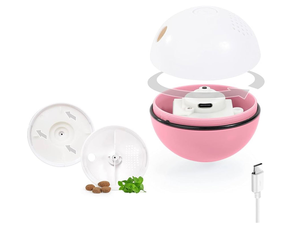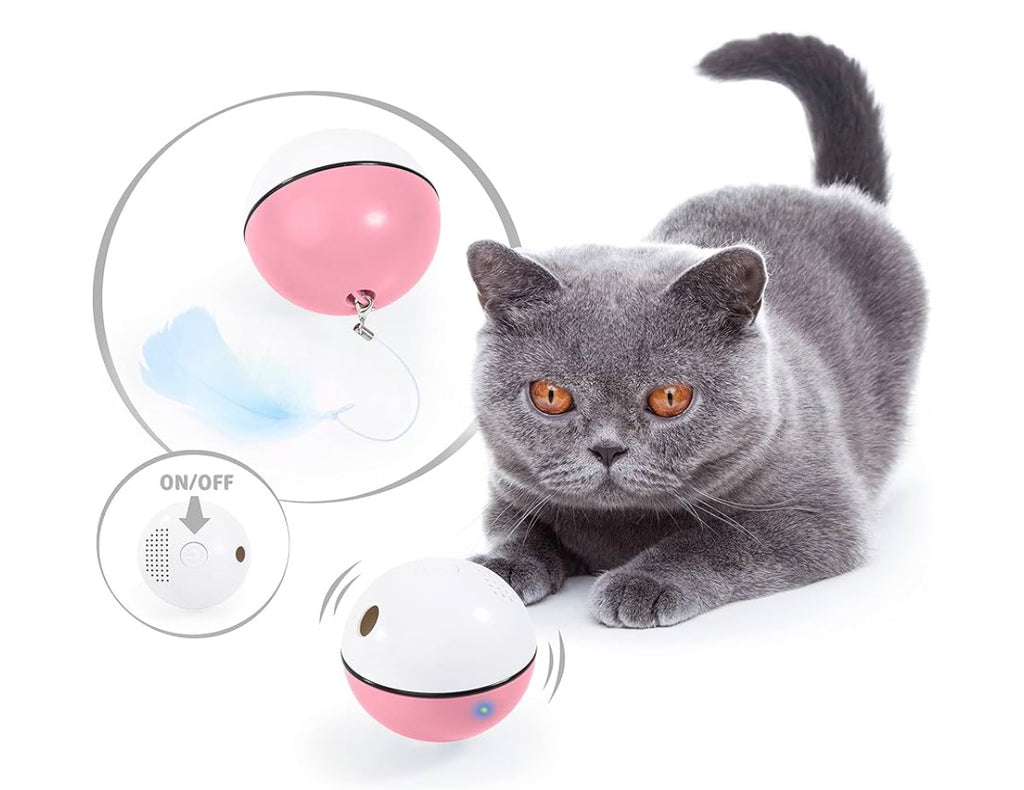 La balle tourne et roule automatiquement Elle s’allume au moyen d’une LED qui change de couleur Il est possible de placer de l'herbe à chat et de la nourriture dans deux parties séparées. En option, il est également possible d’attacher une plume ou un petit jouet USB et le câble de charge USB fourni sont inclus